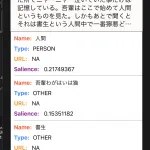 call.requestHeaders.setObject(NSString(string: apiKey), forKey: NSString(string: "X-Goog-Api-Key"))swiftあとはビルドしてアプリが起動すれば完成です。 適当にネットからニュース記事などをコピペして試すと、テキストが解析されてアプリの画面にこのような結果が表示されます。